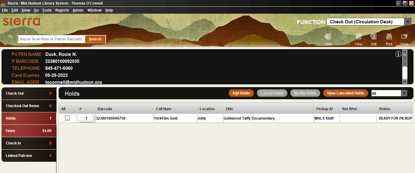 To cancel a patron’s hold, go to the Holds tab in the patron account in Sierra’s Check Out (Circulation Desk) function.