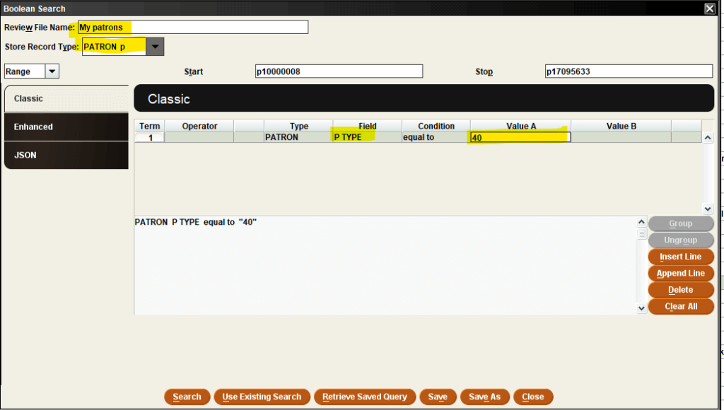Note: This is different than when you search for items, because with items you can be certain of the barcode prefix, and change from the entire range of records to search by index of barcode, where you would include the first 5 digits of your barcode in the “start” and “stop”. - Your search will be: